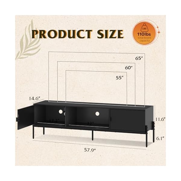 entury Modern Style】The minimalist cabinet combined with metal legs styling brings mid-century modern charm to your bedroom and living room. The cabinet door with metal pulls for easy opening and closing while adding chic charm to all decorating styles, and can also be paired with other furniture in your home for the perfect look. Demission of the TV stand: 57.9″D x14.6″W x 17.7″H, and suitable for 55/60/65 inch TV.