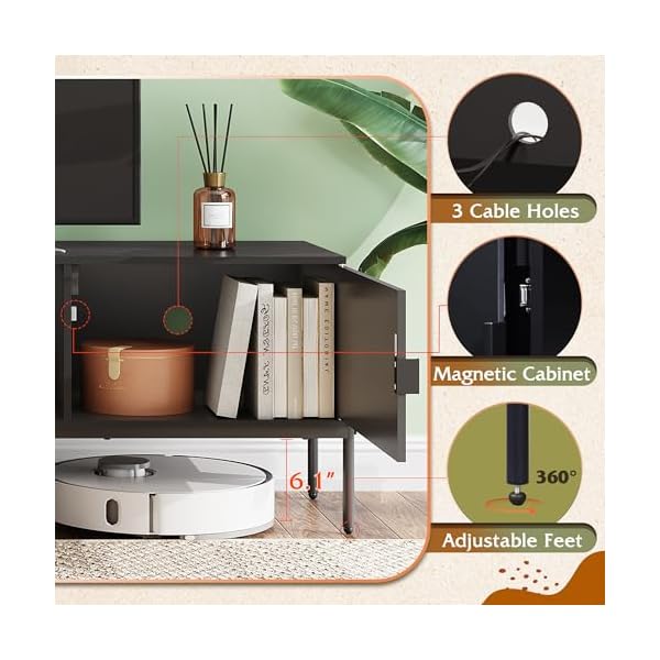【User-Friendly Details】This TV console table has many thoughtful details. First, the media console with 3 cable management holes. making cables easy from devices to pass through. Secondly, adjustable feet height can be adjust, and the bottom height also allows for easy cleaning. Lastly, the door is equipped with magnetic catch, which saves energy and is quiet when opening and closing. These details can add convenience and fun to your life.