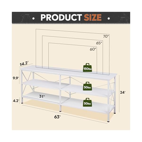 [STABLE & STURDY] The TV stand features X shape design and heavy duty rust-proof steel frame ensure the structure is stable and sturdy enough. Rubber adjustable feet help to adjust height easily, even on uneven ground.The TV Console made of high quality MDF board, not easily deformed and good for clean. The table top can hold up to 150 lbs, each shelf can hold up to 50 lbs.