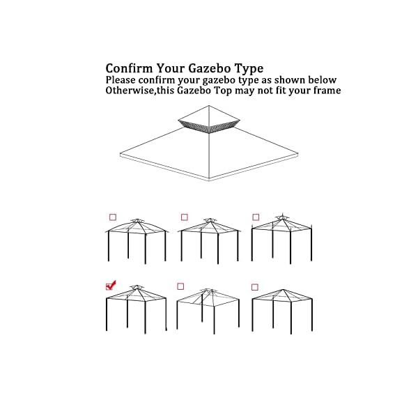 FIT: DURCOVER gazebo replacement top only fit 10x10ft gazebo, which has dual tier canopy frames. Please confirm the gazebo type is the same as shown in the picture and measure the frame size before purchasing.