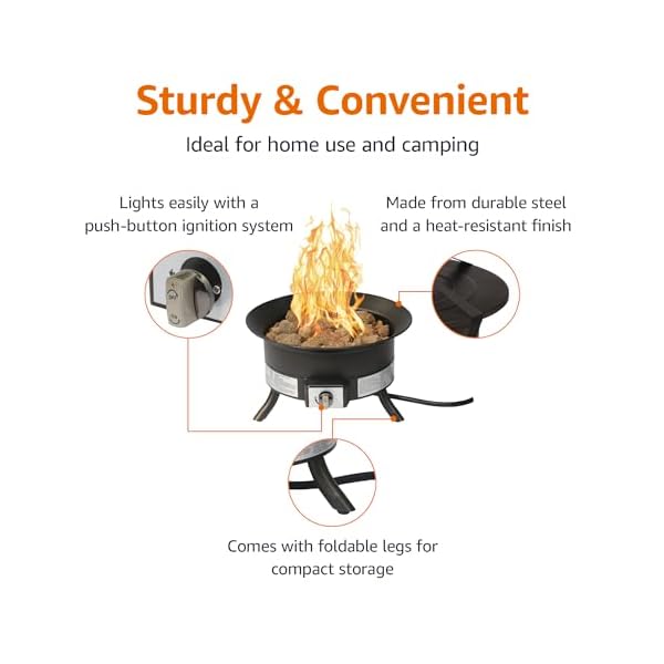 Includes a 19 inch outdoor propane gas fire pit, carry strap, burner lid, lava rock, and 10 foot gas hose with regulator