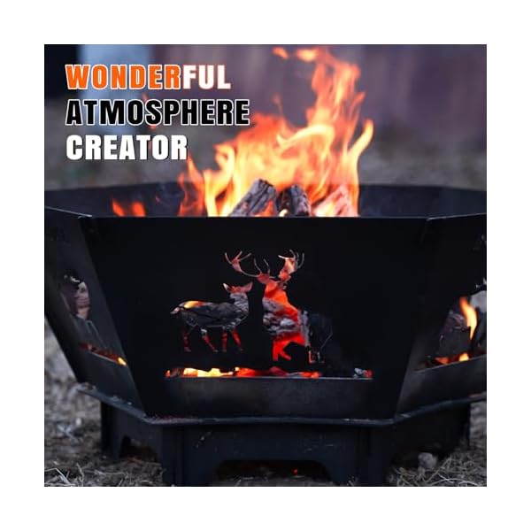 🔥【𝐃𝐚𝐧𝐜𝐢𝐧𝐠 𝐅𝐥𝐚𝐦𝐞𝐬】The 6 side plates come in 2 different patterns, the hollowed deer design allows the flames to flicker and create a cozy and romatic atmosphere. This enhances the camping experience and appeal. The patio fire pit is ideal for use with 4-6 people.