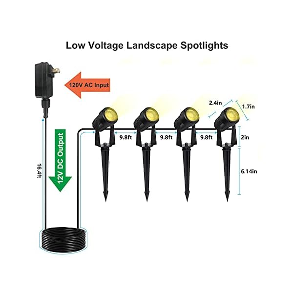 【Easy to Install, Plug and Play】Wired landscape lighting kits are includes 4 spot lights, 1 transformer and cables for fast and easy set up to brighten your yard. Just stick into the ground or use the included screws to mount on the wall, simple to install, hassle-free to use