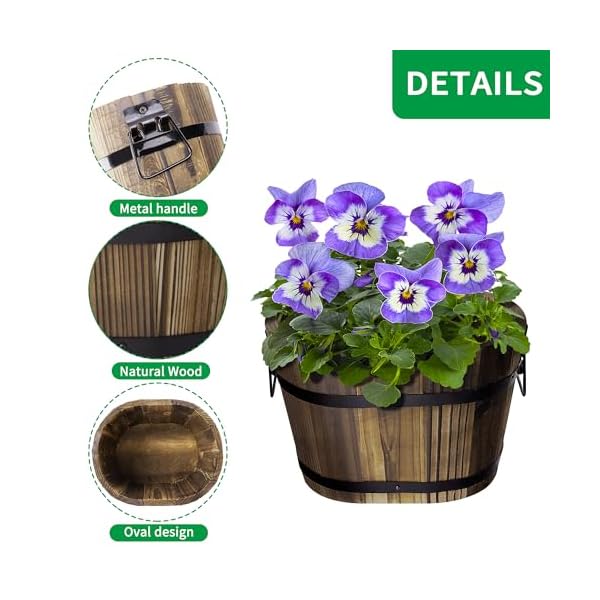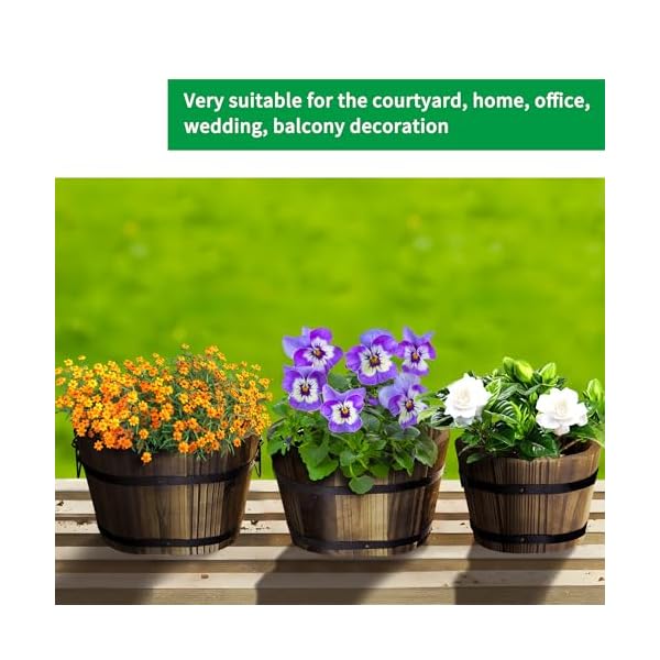 【Durable Material】Our whiskey barrel planter is made of antiseptic wood, ensuring great strength and durability,which means it can withstand harsh sunlight and harsh winters,you can use it indoors and outdoors freely.
