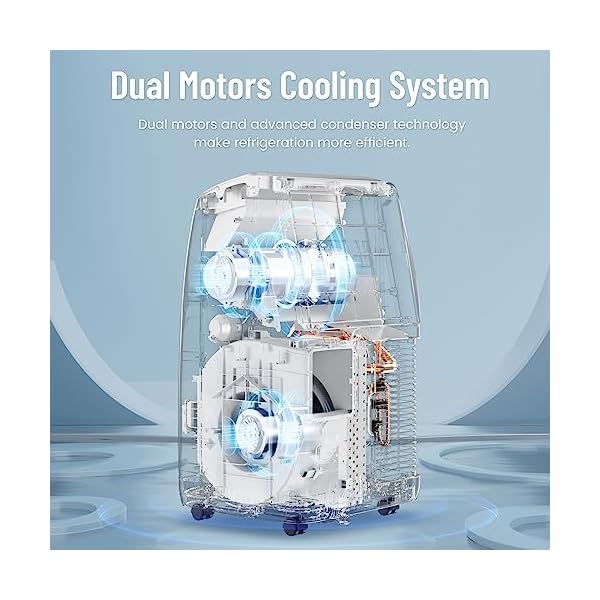 【Dual-motor Portable AC】: Compare with Single motor units,it makes the air conditioner more energy-saving, and has more excellent cooling effect. It’s also more quieter when working.The MAX noise is 54 dB.Self-evaporation is also an important feature of portable air conditioning as it can reduce drainage operation of the air conditioner effectively.