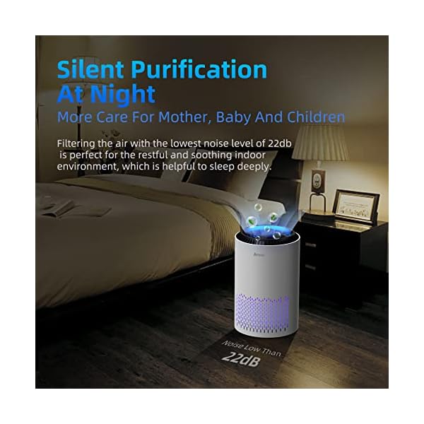 Low Decibel Operation: AROEVE air purifier operates quietly, especially when the sleep mode is activated, which reduces the fan speed to the lowest setting, effectively eliminating any noticeable sound. The filtered air noise is as low as 22 dB, making it ideal for creating a peaceful and relaxing indoor environment while still providing effective purification.