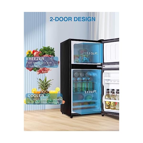 Double Door Design: The refrigerator has a large capacity of up to 3.5 cu.ft. Double Door Design. This refrigerator is 2.3 cu.ft in size. Keep food neat fresh food capacity and 1.2 cu.ft. Freezing capacity for storing frozen food. You can access a mini freezer or cold room with two exterior doors.