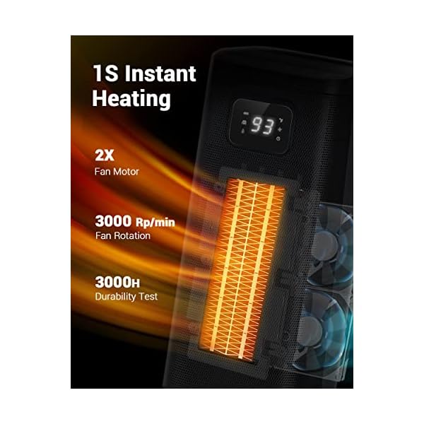 1S Rapid Heat for Winter Prep: Don’t Let the Winter Chill Overwhelm You! Our advanced tower space heater features two motors with speeds up to 3000 Rp/min, ensuring you can quickly create a warm and welcoming environment in any room with its powerful 1S instant heat. Say goodbye to shivering and welcome to the soothing warmth our heaters provide.