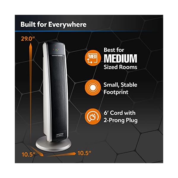 Lasko’s Ceramic Tower Heater features a programmable thermostat with an 8-hour timer. It has an elongated heating element, widespread oscillation and penetrating air velocity push to warmth throughout the room. Its safety features include self-regulating ceramic element, overheat protection and cool-touch housing. This space heater is an excellent choice for heating your living room, bedroom and more. 3-year limted warranty.