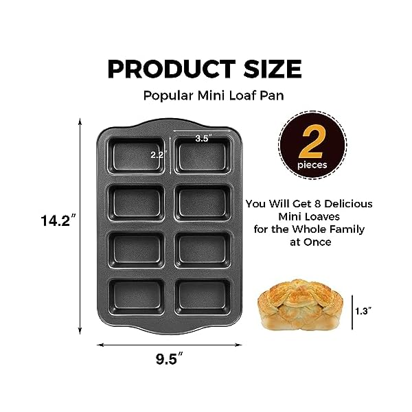 STANDARD SIZE & 8 HOLES – Each cavity is 3.5 x 2.2 x 1.3 in. Every mini bread loaf pans are 14.2 x 9.5 x 1.3 in. It’s very convenient to place them in a kitchen drawer or cabinet. The oven is safe to 450℉.