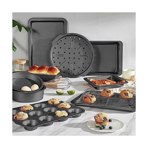 ALL-IN-ONE SET & VARIOUS CUISINE AT WILL – Complete 10-piece baking set has a scientific and reasonable collocation, including a roasting pan (15*10.2*2.3 IN), a half sheet pan (17*12*1 IN), a jelly roll pan(15*10*1 IN), a cooling rack, a standard-size muffin pan (14.6*9.8*1.2 IN), a loaf pan (9.8*4.5*2.2 IN), a pizza pan (14*1 IN), a square cake pan (8*8*2 IN), a deep cake pan (8*8*2.5 IN) and a shallow cake pan (8*8*1.3 IN)