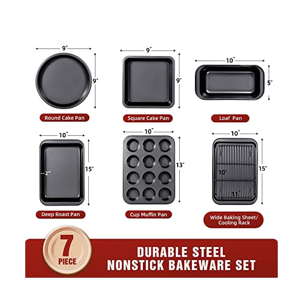 COMPLETE 7-PIECE BAKEWARE SET – Including a round cake pan, a square cake pan, a loaf pan, a cup muffin pan, a cookie sheet, a cooling rack, and a deep roast pan. All pieces of our baking set were designed to fit neatly into one another, saving you valuable space in your kitchen cabinets. The nonstick baking pans set will fit into regular kitchen cabinets or under standard kitchen ovens.