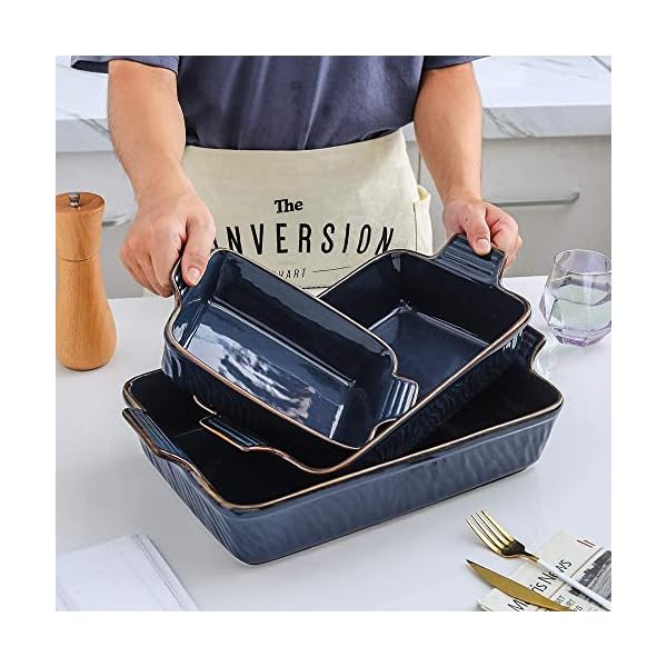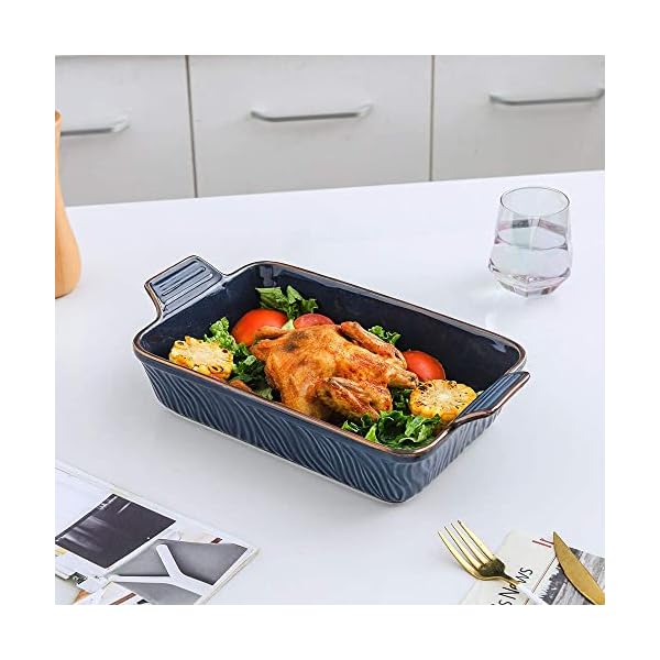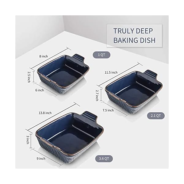 GOOD SIZE FOR DAILY USE: The KOOV bakeware set includes 3 pieces bakewares of difference dimensions ( excludes the ears’ size): 13″L x 9″W x 2.7″H and 11.6″L x 7.8″W x 2.7″H and 8.6″L x 6.2″W x 2.3″H, suitable for lasagna, spaghetti, chicken, meat, beef, roasting, vegetables, storing and reheating leftovers and etc.