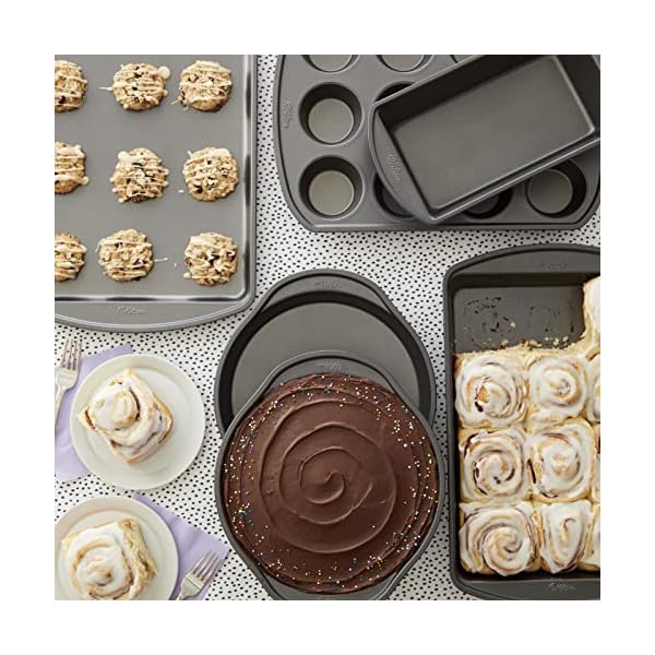 Perfect for everyday use, this Wilton Perfect Results Bakeware Essentials Nonstick Bakeware Set is great for baking your favorite cookies, cupcakes, cakes and more! Featuring a durable, nonstick coating for easy release and constructed for even heating, this bakeware set ensures your sweet and savory foods turn out perfectly every time. This 6-piece set includes: two 9 in. round cake pans; one 15.2 x 10.2 in. sheet pan; one 13 x 9 in. oblong pan; one 9.25 x 5.25x 2.75 in. loaf pan; and one 12-cup standard muffin pan. The round and oblong pans are great for baking cakes for birthdays or holidays, while the muffin pan can be used to make cupcakes or muffins for your party or celebration. The baking sheet can be used to make cookies, roasted veggies or frozen appetizers and the loaf pan is great for banana bread, meatloaf and more. A great beginners baking set, this collection of standard pans gives you great results and years of easy, stress-free baking. This product contains: Steel (Iron, Aluminum, Zinc, Manganese, Phosphorus). For more information about the chemicals in this product, visit/Para más informacíon sobre los químicos en este producto visite Wilton.com/california-ab-1200.