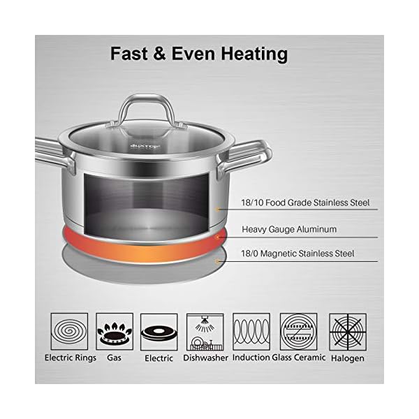 HIGH QUALITY MATERIAL: This 4.2 quarts stockpot is manufactured with 304 food grade stainless steel, which maintains the flavor of the food. Heavy gauge impacted-bonded aluminum encapsulated bottom of the cooking set provides a quick, even and energy-efficient heating.