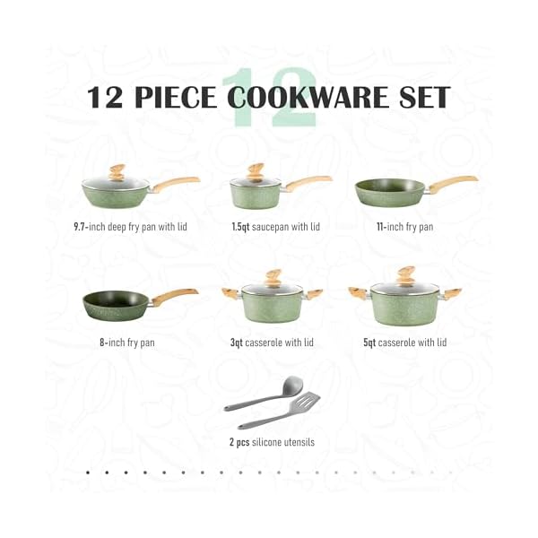 Kitchen Pans and Pots Set Includes: 8.15″ fry pan, 9.75″ fry pan, 9.75″ Deep Fry Pan with lid, 1.5QT saucepan with lid, 2.75QT casserole with lid, 5QT casserole with lid, 2 pcs nylon utensils. Our cookware set will meet your various demands of everyday cooking for you & your family