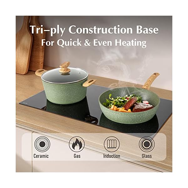 Heats Quickly & Evenly: This cookware uses professional grade aluminum core that conducts heat quickly and evenly with precise temperature control, which will save time and energy. This induction frying pan set can adopts various cooking methods to make delicious food to satisfy your stomach