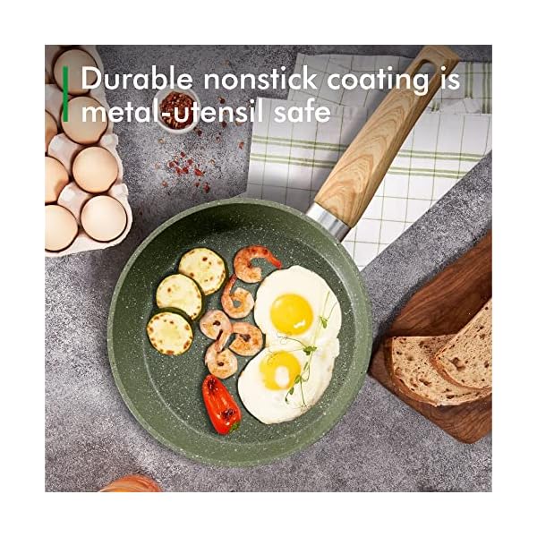 Eco-friendly Non-Stick Granite Coating: Our pan set interior & exterior is coated by high performance non-stick granite coating, which makes the nonstick skillet easy to cook and clean. It means minimum oil or butter useing for healthy diet cooking and easier do a better cooking