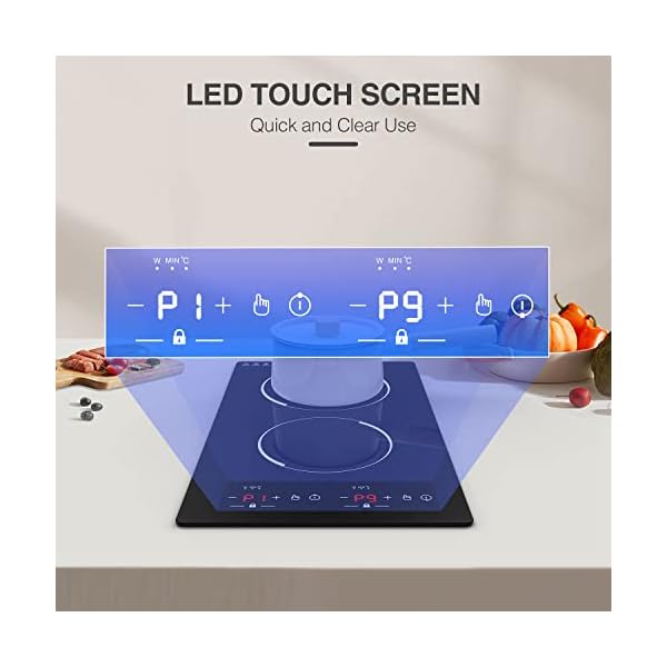 【Dual Heating Zones】GTKZW double induction cooktop 120v with two independent heating areas and independent LED display,The power is 1200W+1100W(P1-P9).It can cook 2 dishes delicious food at the same time quickly,saving a lot of time.