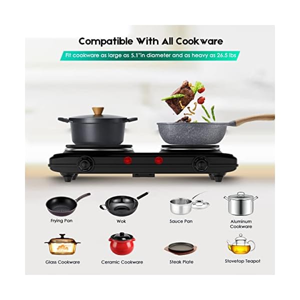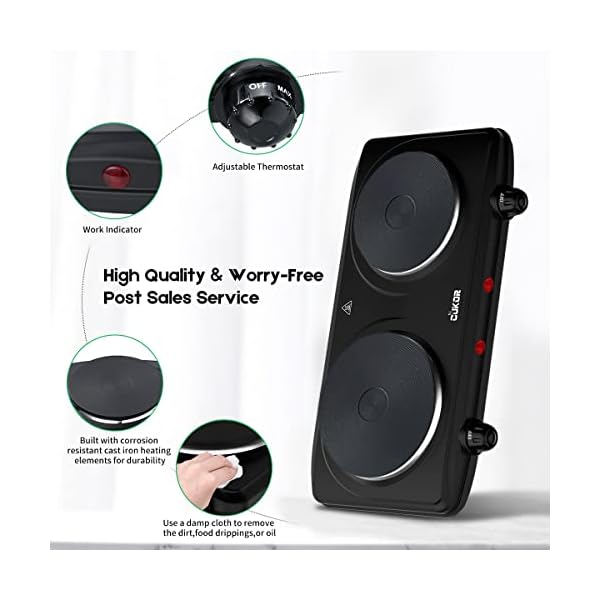CONVENIENCE: Being small in size and light in weight, the compact design means the burner consumes little space in cabinets or on countertops, thus can also be a perfect travel solution. Easy cleaning with wet cloth. It is an ideal choice in many places such as student dorms, offices, campsites, RVs and home. Cast-iron hot plate needs to be preheated for 10 minutes for best use, and cools down gradually, keeping the food warm longer. Please do not touch the burner body when in use.
