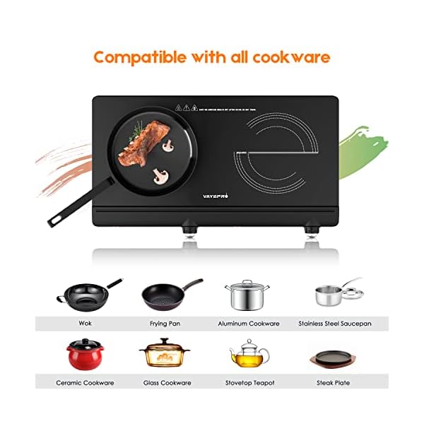 COMPATIBLE WITH ALL COOKWARE:Can accommodate cookware as large as 7.1” in diameter and as heavy as 22 lbs. Different than an induction cooker, the infrared burner can be used with any pan-shaped cookware made of aluminum, stainless steel, ceramic or glass (e.g., frying pans, woks and stovetop teapots).