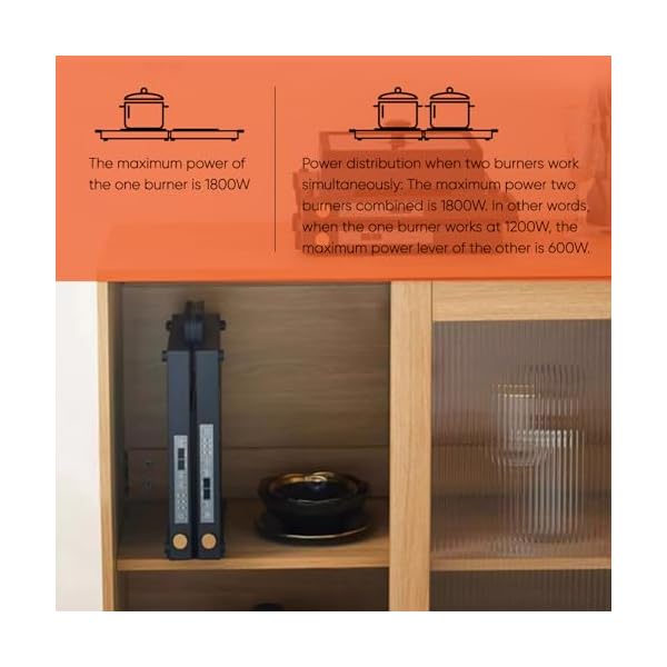 5.【Intelligent Safety Design】: When operating 2 induction cooktops at the same time, the maximum power of one induction stove doesn’t exceed 1200W for safety. When only one operating, the maximum power of one induction stove is 1800W. Featuring flame retardant material on the heating area’s surface, automatic pot detection, and multifunctional protection, our induction range allows for synchronous or independent burner operation, with a mechanical switch knob to act as a child lock.