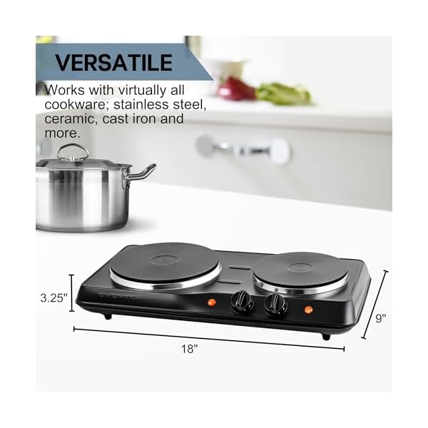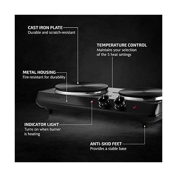 EFFICIENT POWER – This double burner is equipped with a 7.25” and 6.10”cast-iron plate and powered by 1700 watts (120V). It heats up quickly and cooks food evenly. Suitable for frying, keeping food warm, boiling hot water or soup.