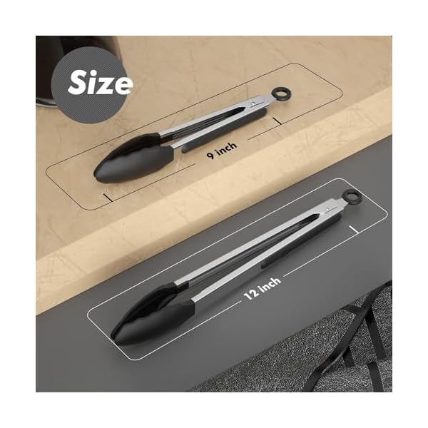 [304 Stainless Steel & BPA Free Silicone] The standard 9″ serving tongs with the Premium Silicone tips and the large sized 12″ BBQ grill tongs with the 304 Stainless Steel tips. The newest Set of 2 Premium Silicone no-slip grip Kitchen Locking Tong ensures good grip and control. No odor EVER.
