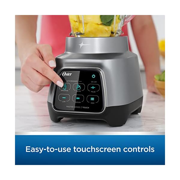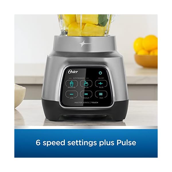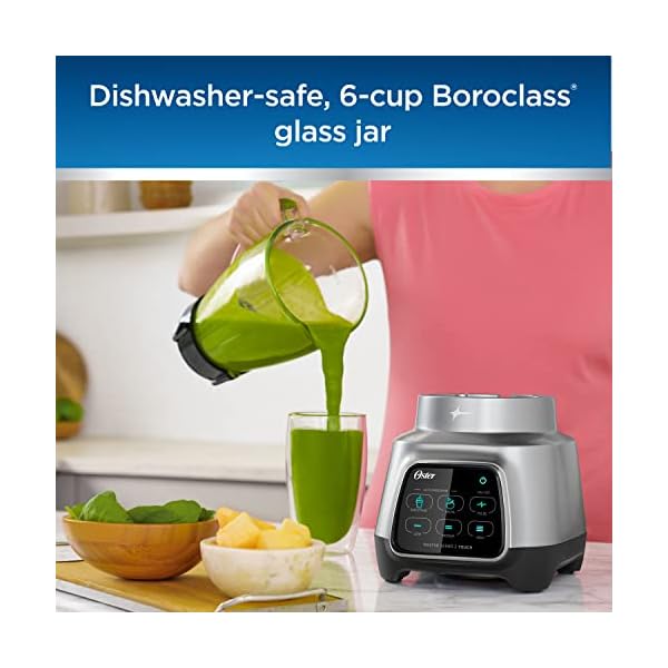 This Oster Power Blender features 800 watts of powerful blending performance with intuitive touchscreen controls. The simplified touchscreen uses Easy Touch Technology to help you blend your favorite treats with ease. Just touch one of the 2 auto programs for 1 second, and then release for smoothies and salsa in no time. Featuring an 800-watt performance motor and extra-large, 6-point stainless steel blade, this Oster blender effortlessly blends ice and tough ingredients. Just add your juices or liquids, then your fresh fruits and veggies, and finally your frozen ingredients to create smooth and consistent blends. With 6 speed settings and Pulse functionality, the power blender is perfect for creating smoothies, frozen drinks, salsas, and more. Enjoy more without the hassle of extra cleanup with the extra-large, dishwasher-safe, 6-cup Boroclass glass jar. The All-Metal Drive was designed for durable performance and tested for up to 10,000 blends.