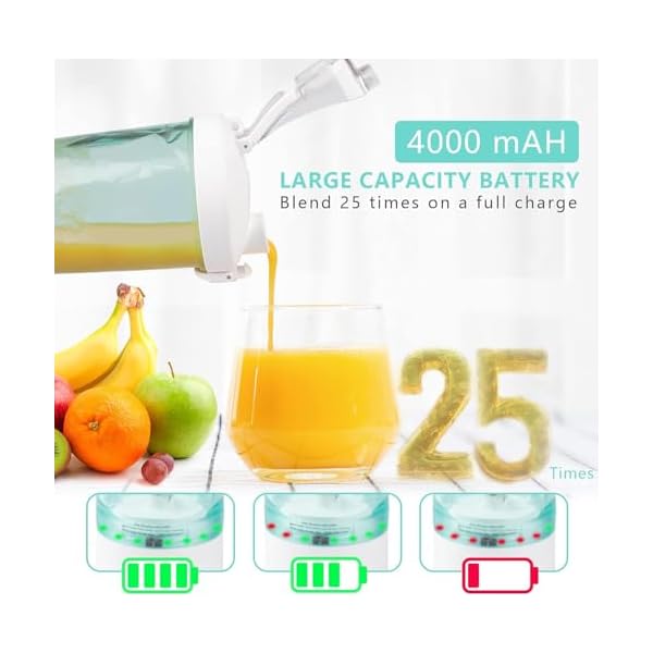 【EASY TO BLEND & SAFETY PROTECTION】 Just a few simple steps to make delicious smoothies! Add the ingredients you want to mix, then click the button once to start blending (lights flash green), or double-click the switch to pulse mode (lights flash yellow) for blending. The blender bottles electric also has decent safety features, the blender won’t work and lights flash red to remind you that you haven’t tightened the bottle onto the base of the juicer, which greatly ensurs the blending safety.