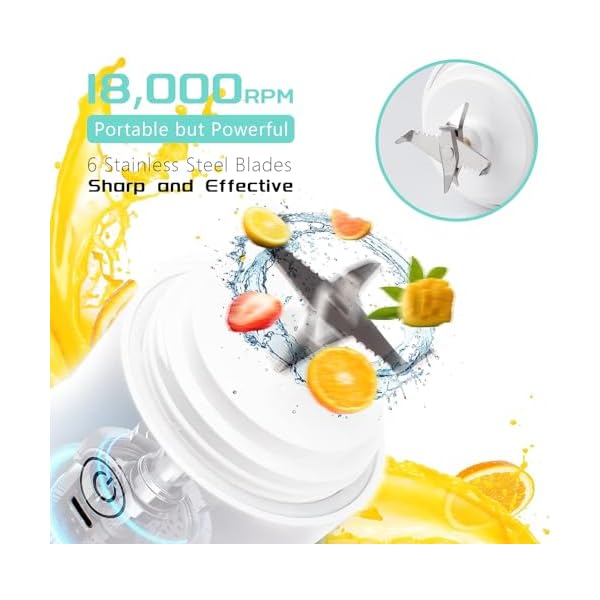 【POWERFUL BLENDING PERFORMANCE】This portable blender features an advanced copper casting motor with a rotating speed of up to 18000 rpm. Smoothie maker blender combines with six-leaf stainless steel blades, making it powerful enough to extract smooth and delicate juice from even the toughest fruits, vegetables or ice cubes quickly and efficiently. Make nutritious, delicious, and healthy shakes or smoothies within 30 seconds!