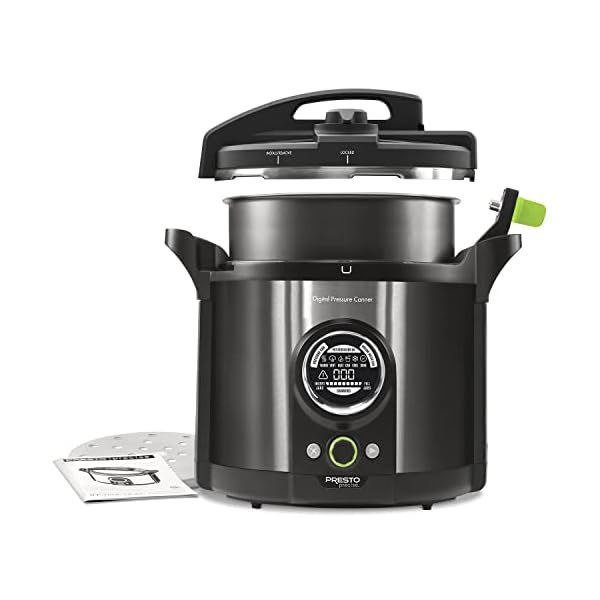 Presto Precise Digital Pressure Canner 120 volts AC, 1485 watts Liquid Capacity: 12 quarts (11. 4 liters) Stock No. 02144 Finally, an automated electric canner for simple home canning! The Presto Precise canner is the first digital pressure canner that meets USDA home canning guidelines for safely processing low-acid foods such as meat, poultry, fish, and vegetables, with no adjustments needed for high altitudes. It also doubles as an electric boiling water canner for preserving fruits, jams, jellies, and salsa. Simply select the canning method and time and the digital interface guides you through the canning process. LED display icons illuminate each step from start to completion. An innovative sensor automatically detects the exact processing temperature and holds it for the time required to safely preserve foods. The digital canner preheats the jars and keeps them hot until each jar is filled and ready to process. To simplify the boiling water method, the temperature sensor detects the boiling point and automatically activates the canning process for the required time to safely process high-acid foods. No need to watch or adjust settings, and the canner holds heat inside keeping your kitchen cooler. Includes an instruction book with research-based recipes that use standard processing times in accordance with USDA guidelines, and a handy quickstart guide. After canning is finished, the removable pot enables easy water removal and cleaning. Presto Precise digital canner, engineered by a trusted leader in pressure canning for over 100 years, is equipped with ten built-in safety features including a cover locking system and an alert symbol that indicates an incomplete canning process. Canning rack included. Regular mason jar capacity: 10 half-pints, 8 pints, 5 quarts (Half-pints and pints only for boiling water method).