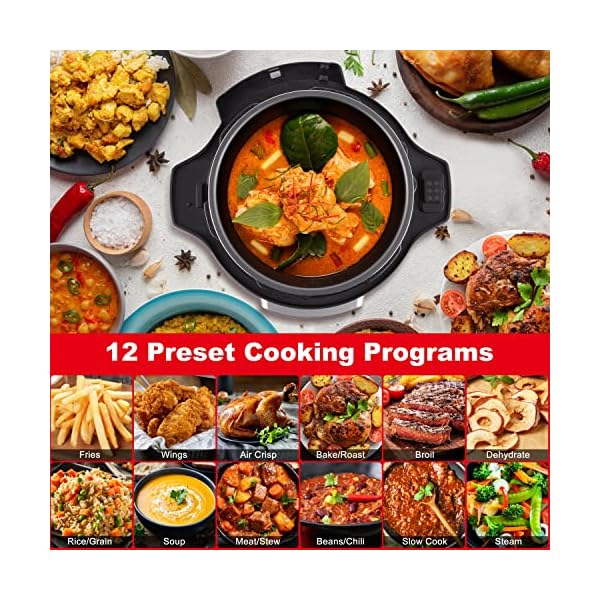 [Ultimate Cooking Versatility]12 one-touch preset programs make it quick and easy to meet different cooking needs. Includes Fries, Wings, Air Crisp, Bake/Roast, Broil, Dehydrate, Rice/Grain, Soup, Meat/Stew, Bean/Chili, Slow Cook and Steam. Delay and keep warm settings give more flexibility for busy days when you dont necessarly have the time to cook