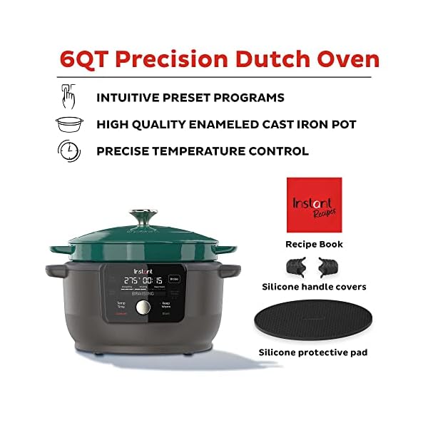 The Precision Dutch Oven gives you precise control for braising, searing/sautéing and slow cooking, delivering gourmet results for your meals. The heavy-duty cooking pot and lid are made from cast-iron, with a durable enamel coating for long life and beauty. The cooking pot can be removed from the cooker base, so you use it on the stovetop or in the oven, and it’s beautiful on the table for serving. Get pro results easily with the Precision Dutch Oven.