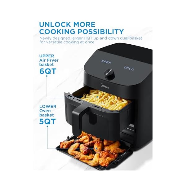 INNOVATIVE DOUBLE-DECKERS DESIGN: This dual air fryer features both an upper 6QT basket and a lower 5QT baking pan, providing 11QT large capacity but taking up smaller footprint with its exclusive design. Basket for fries, nugget, and pan for pizza, bread. It is all up to you!