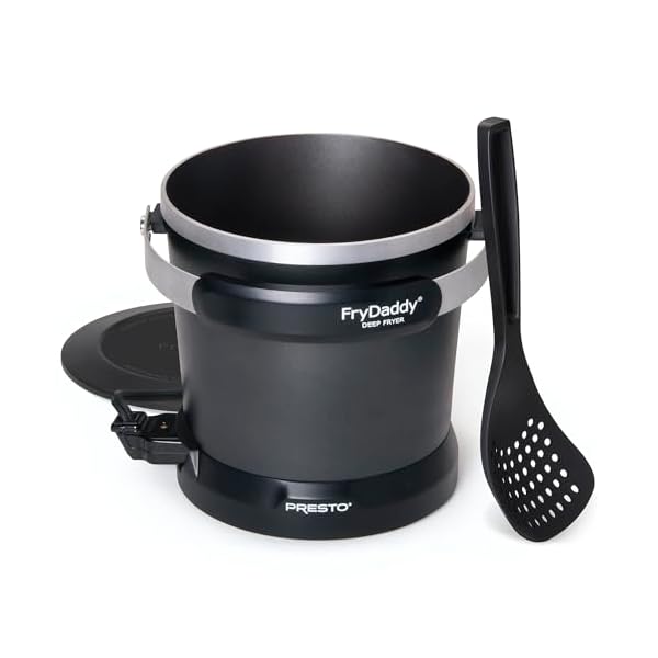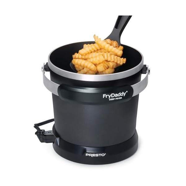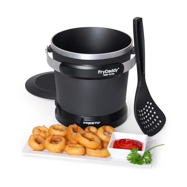Fries 4 generous servings with just 4 cups of oil. Perfect frying temperature is maintained automatically. Scoop separates, stirs, lifts, drains and serves for no messy basket to clean. Snap-on lid stores oil for reuse without spills or odor. Heavy cast aluminum body. Non-stick surface inside and out for easy cleaning. 120 Volts AC, 1200 watts. U.L. Listed.