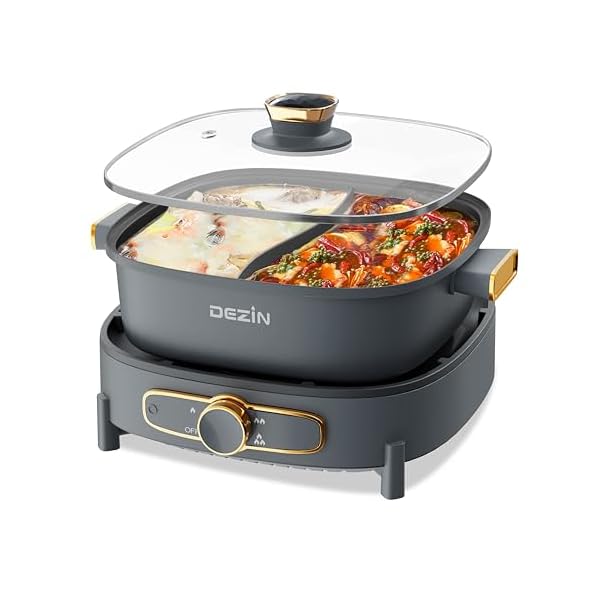 Dezin Hot Pot Electric with Divider, 5.5L Double-Flavor Electric Shabu Shabu Pot, Removable Non-Stick Dual Sided Electric Cooker,3″ Depth Divided Pot with Multi-Power Control,2 Silicone Ladles Include