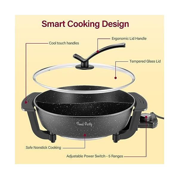 🍲Dual Sided – The Food Party hot pot is dual-sided, allowing you to simultaneously cook two different broths. If your family and friends diverge in terms of their hot pot soup base preferences (spicy versus non-spicy), this hot pot with divider is the best choice for promising an unforgettable gastronomic adventure.