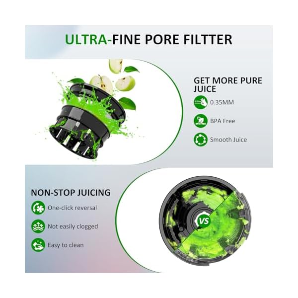 🥒【Reverse Function & Safety Protection】Cold press juicer has a reverse function that effectively prevents clogging. If tangling problems occur, they can be easily solved by simply pressing and holding the REV button. The juicer machine is equipped with an intelligent protection chip to ensure your safety when using it. When the machine is overheated it will automatically stop working to avoid accidents. The safety lock system ensures that the juicer can only operate after the correct installation is completed, effectively preventing misuse.