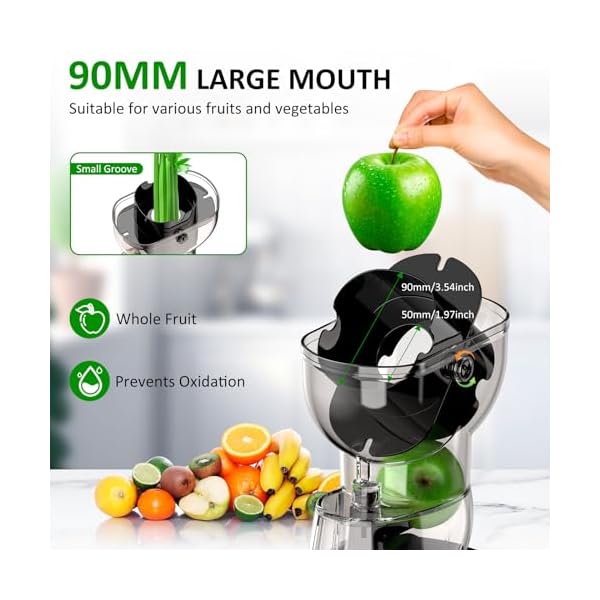 🍏【90MM Large Dual Mouth Feed Chute】Masticating juicer machines is designed with auto turning dual feed chute, which can reduce the tedious work of manual flipping. 99mm large feed chute supports whole fruits to be put in directly without cutting, which greatly saves preparation time. 50MM small feed chute for fruit and vegetables in strips to be put directly into. The masticating juicer machine is also equipped with a booster, which can help you easily push the fruits into the juicing area without effort, safer and more efficient.