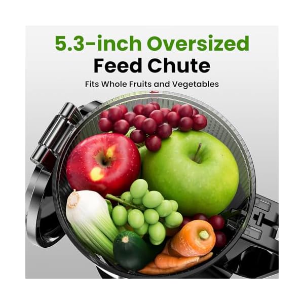 FITS WHOLE-SIZED FRUITS: Our Fully upgraded 5.3-inch feed chute is 3 times larger than normal. You can now add whole-sized apples without chopping them up. Juice more and save time.