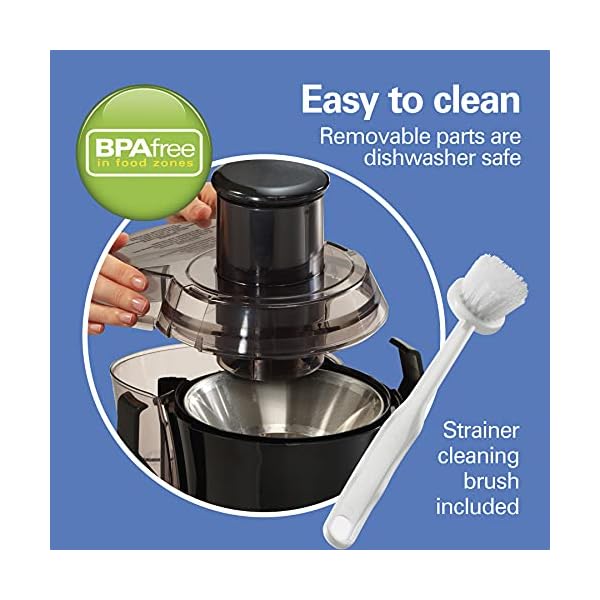 EASY TO CLEAN: Cleaning up after you juice is easy. The juice extractor comes with a convenient strainer cleaning brush, and the juicing cup, pulp bin, juice bowl, lid and pusher are all dishwasher safe.