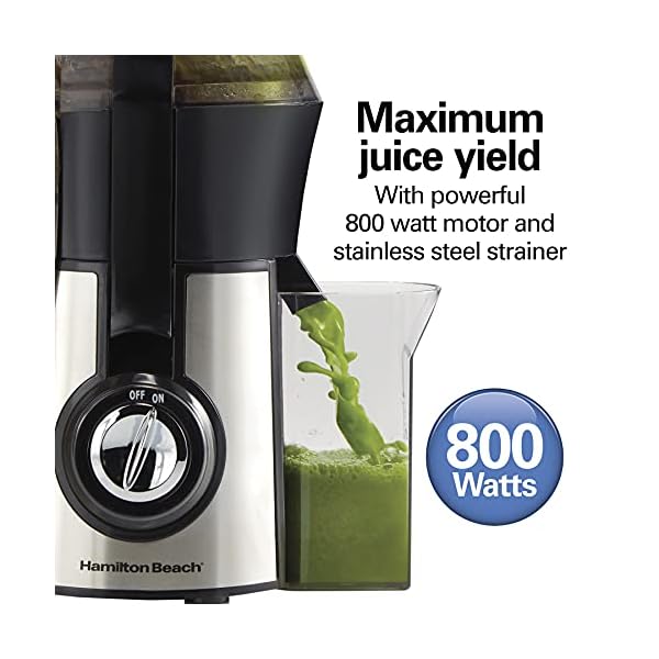 MAXIMUM JUICE YIELD: Juice everything from dense beets to leafy greens. The powerful 800 watt motor and stainless steel strainer on the juice extractor ensure maximum juice yield, less waste and more flavor. The simple on/off dial is easy to use.