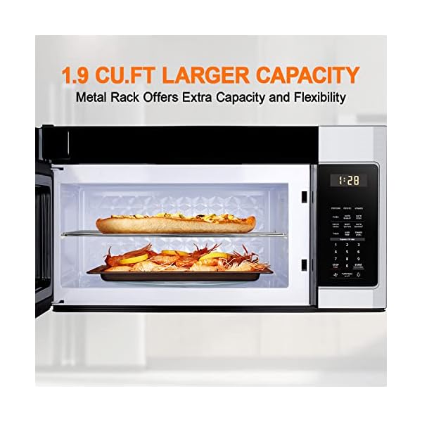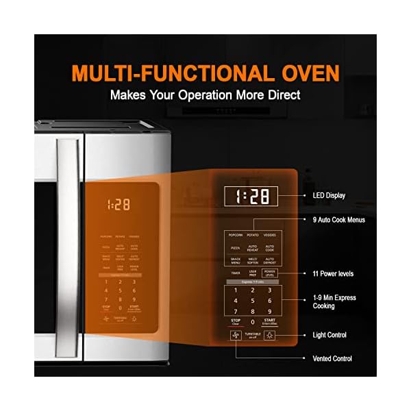 🍕【One-Touch Start】The over stove microwave oven includes one button cooking, 9 presets (popcorn, potato, veggies, pizza, snack menu, melt/soften, auto reheat, auto cook and auto defrost) make any cooking easliy. It is permitted to add 30 seconds more when you use a speedy cooking function.
