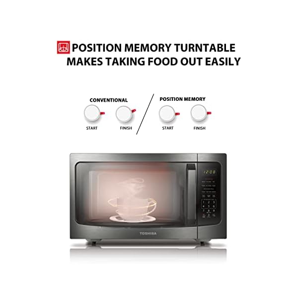 This Toshiba 1.6 cu. ft. 1200 watts microwave oven with its black stainless-steel finish and timeless look can match different kitchen styles. It features a smart sensor function with 6 auto menus, auto defrost & 1 lb. defrost for quick defrosting, cooking with 10 adjustable power levels, soften/melt function, express cook buttons for 1-6 mins, memory function etc. It is equipped with a bright LED light, glass turntable, energy saving eco mode, clock and kitchen timer. The bright LED digital display, easy-to-read control panel and easy-to grip door handle further improve the user experience.