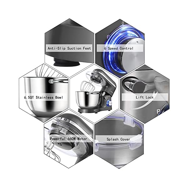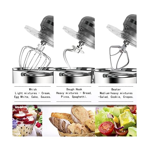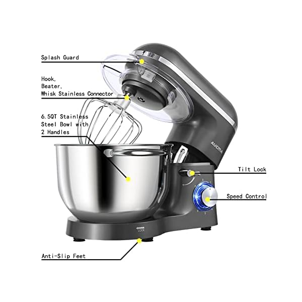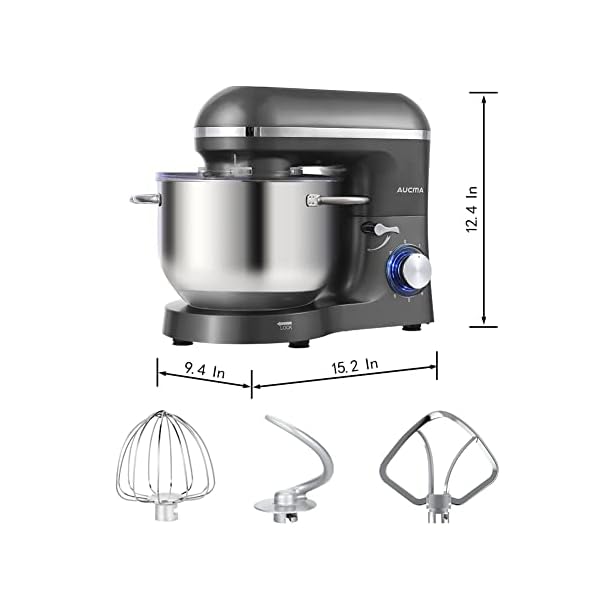 Multiple Attachment Set – Aucma stand mixer comes with three mixing accessories: whisk, dough hook, mixing beater.The splash guard with access hatch helps add ingredients without making a mess.