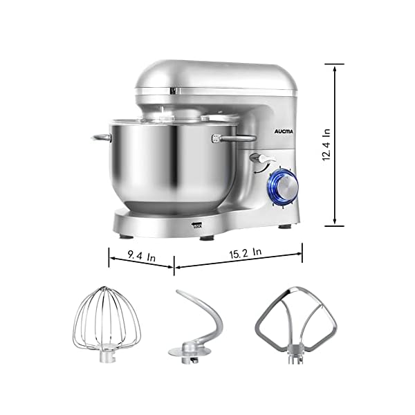 【MULTIPLE ATTACHMENT SET】 Aucma stand mixer comes with three mixing accessories: whisk, dough hook, mixing beater.The splash guard with access hatch helps add ingredients without making a mess.
