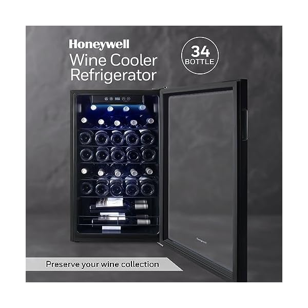 The Honeywell 34 bottle wine cooler has an adjustable digital thermostat, glass door, recessed door handle, and slide-out chrome shelves.