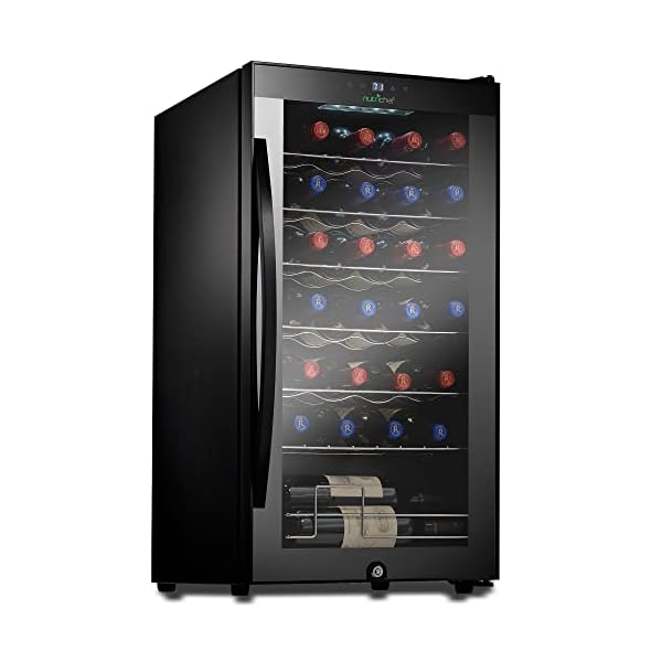Features: Recessed Handle Wine Chilling Refrigerator Cooler (34) Wine Bottle Capacity Digital Touch Button Display Panel Adjustable Temperature Control Celsius and Fahrenheit Selectable (°C/°F) Integrated LED Light with Power Control Sensitive Touch Screen Control Button on Glass Blue Temperature Display Glass Door with Plastic Door Frame Built-in Circulation Fan & Ventilation Grill Includes Contoured, Polished Chrome Wine Racks Free-Standing Design for Floor, Table, or Countertop Placement Low Noise Operation What’s In The Box: Wine Chilling Refrigerator Cellar Technical Specs: Wine Cooler Capacity: (34) Bottles Internal Volume/Capacity: 93.45 Liters Temperature Range: 41 – 64° Fahrenheit (5 – 18°C) Standard Red Wine Bottle (D x H): 3.0’’ x 11.9’’ -inches Housing Construction Material: HIPS (Inner), Lacquered Iron (Shell) Power Cable Length: 6.6 ft. Power: 120V, 60 Hz Product Dimensions (W x D x H): 19.49’’ x 16.93’’ x 33.39’’ -inches Sold as: 1 Weight: 66.3 lbs.