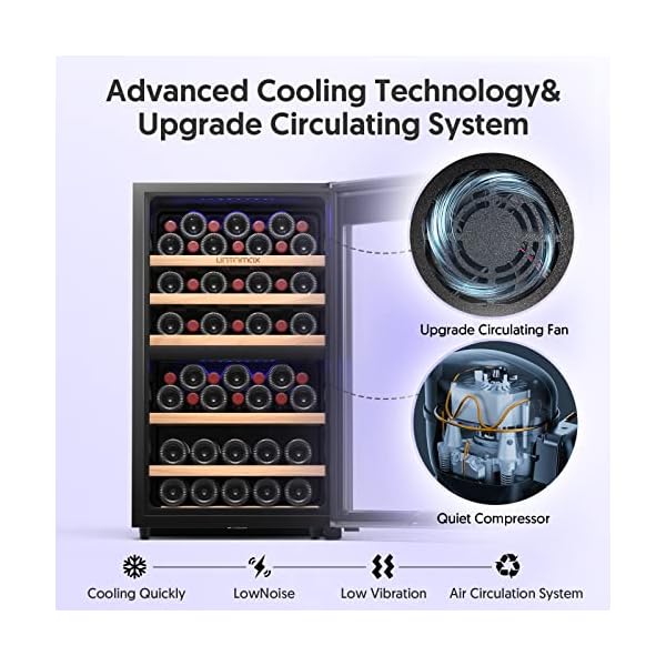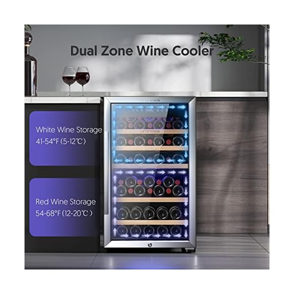 【Dual Cooling Zones】This UNTOMAX wine fridge dual zone is a revolutionary design that addresses the hassles of storing diverse wine collections. Featuring a space for large bottles, such as Champagne, Pinot.The wine refrigerator upper zone ranges from 41°F to 54°F while the lower zone is between 54°F to 68°F. Now, you can preserve your reds and whites, sparkling wine,champagnes. This wine fridge new model is provide the area for larger bottles, such as Champagne bottles.